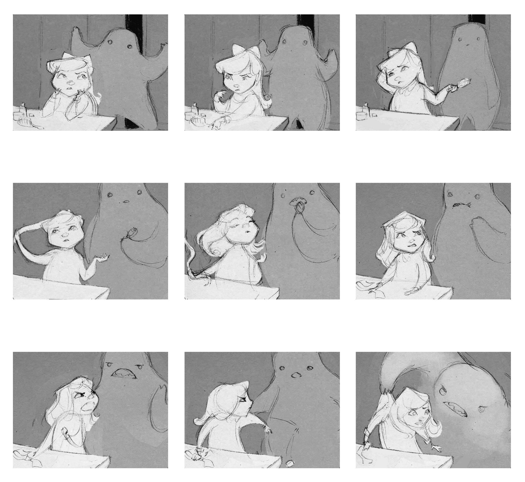 Character animation was done on paper, scanned and cleaned up in Photoshop, then composited in AfterEffects with backgrounds painted in Photoshop.